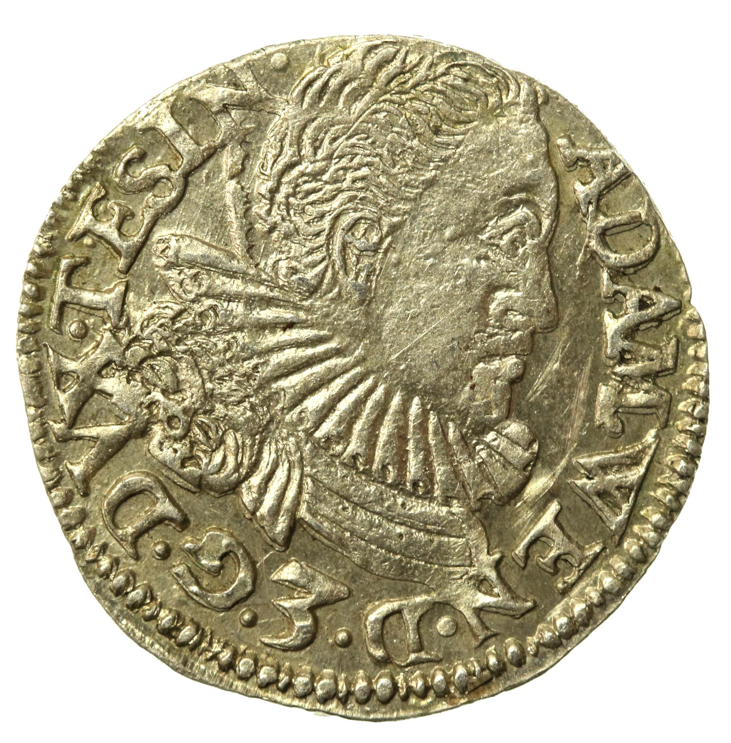 Śląsk - Księstwo Cieszyńskie, Adam Wacław, 3 krajcary 1597, Cieszyn - rzadkie. Stan zachowania 1-/2. Bardzo dobrze zachowana moneta z połyskiem. Niewielka nieregularność krążka i wada blachy, ale jak na ten typ pięknie wybita i zachowana moneta. Dobry detal. Połysk i dużo lustra menniczego. Atrakcyjny egzemplarz. Literatura: Kopicki 5586 (R3), Ejzenhart/Miller 272 (R3), F.u.S. 2989