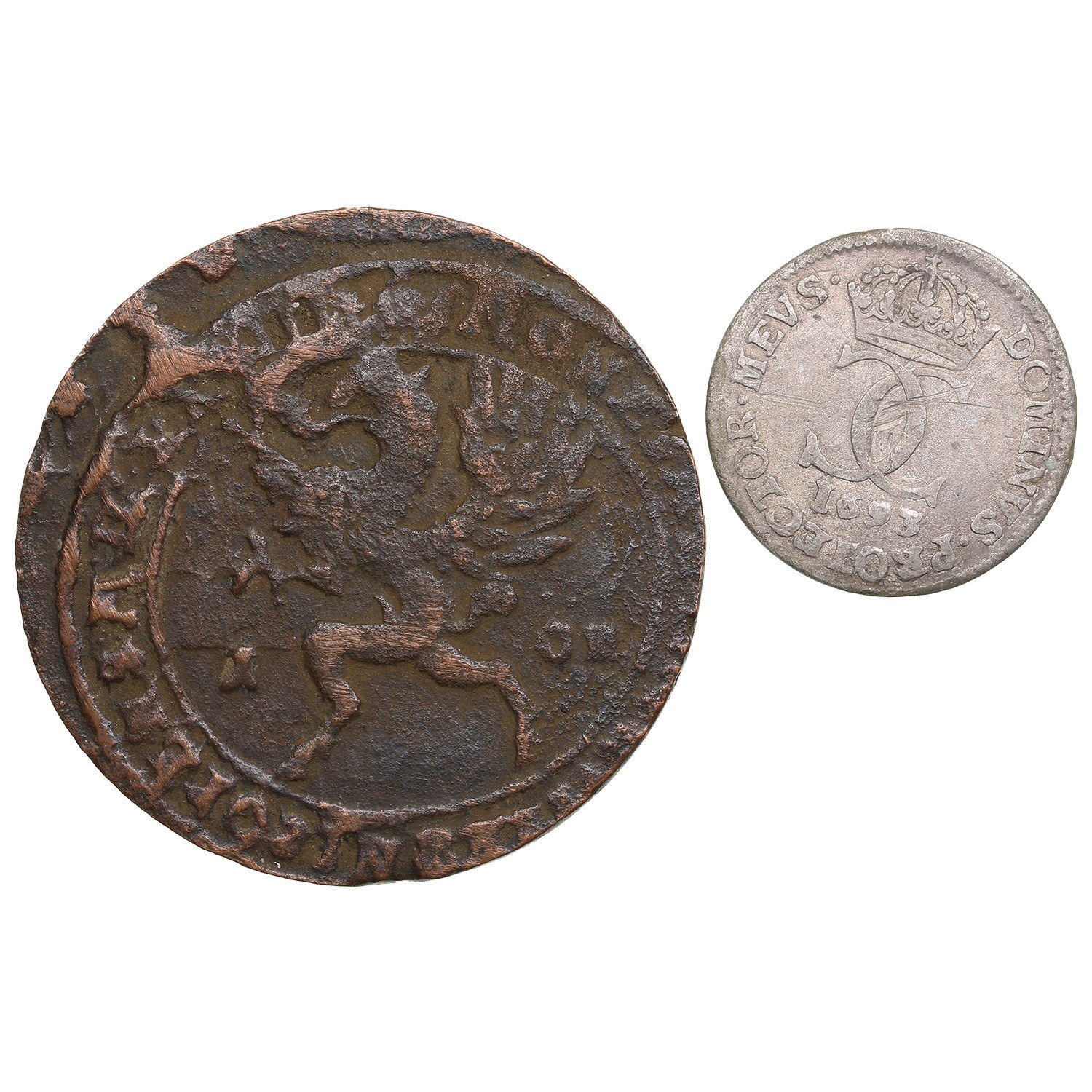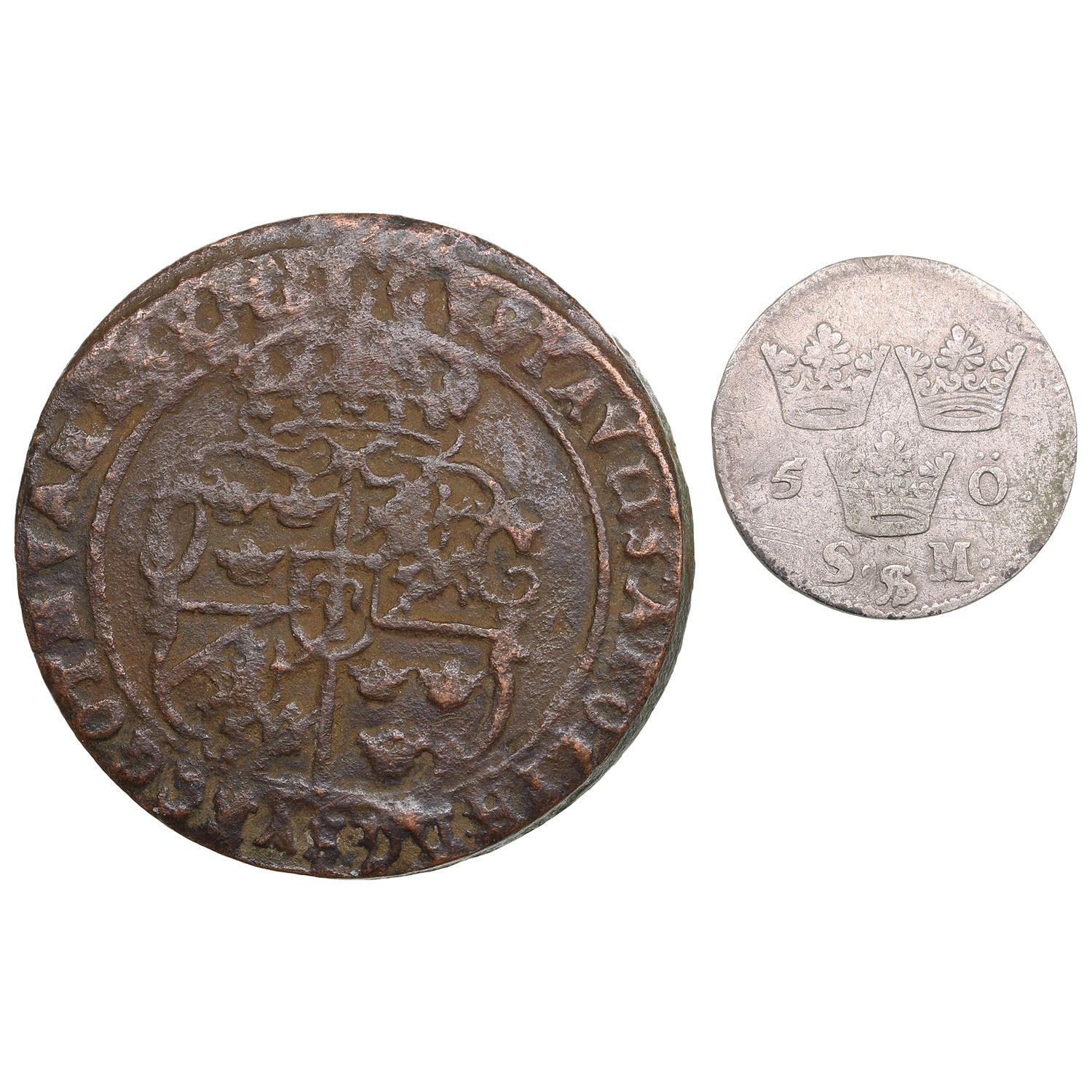Various condition. Sold as is, no return. 1 Öre (Nyköping) 1628 - Gustav II Adolf (1621-1632). SM 184. 5 Öre Silvermynt (Stockholm) 1693 - Karl XI (1660-1697). SM 192.