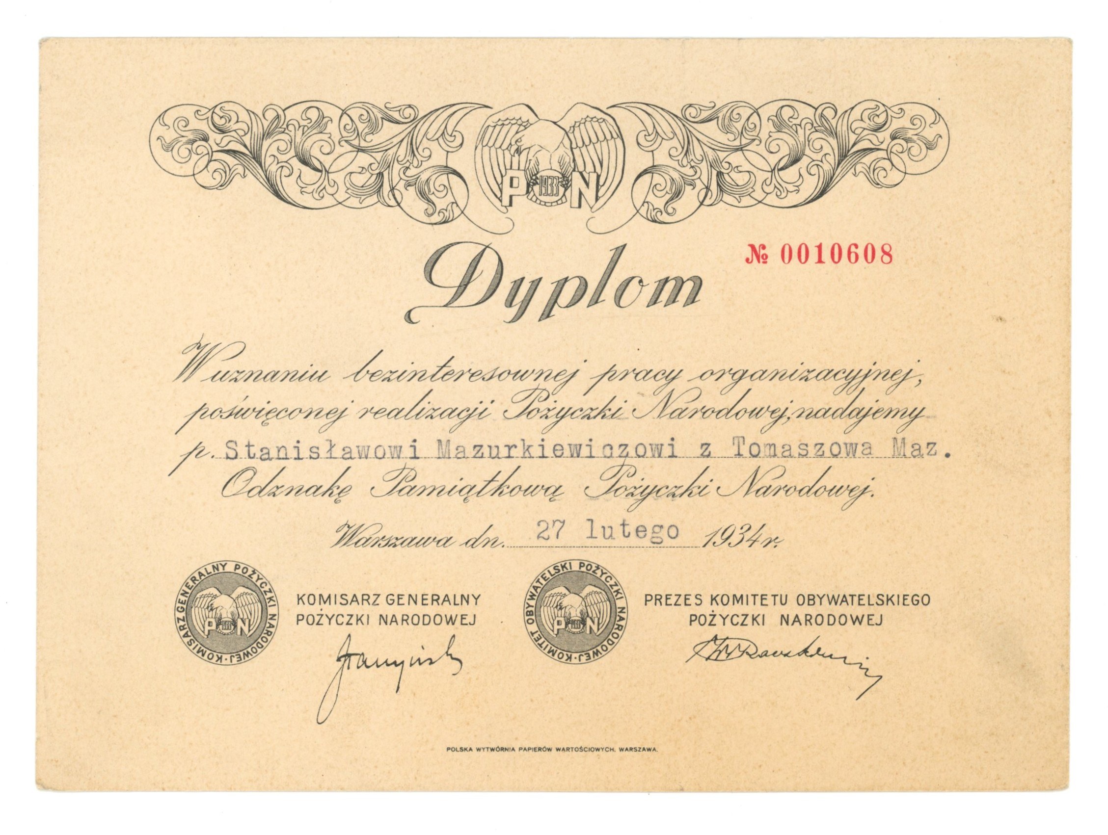 Dyplom Odznaki Pamiątkowej Pożyczki Narodowej dla Stanisława Mazurkiewicza z Tomaszowa Mazowieckiego. Wystawiony w Warszawie 27 lutego 1934 r. Wymiary 18 x 13 cm. Stan bdb.