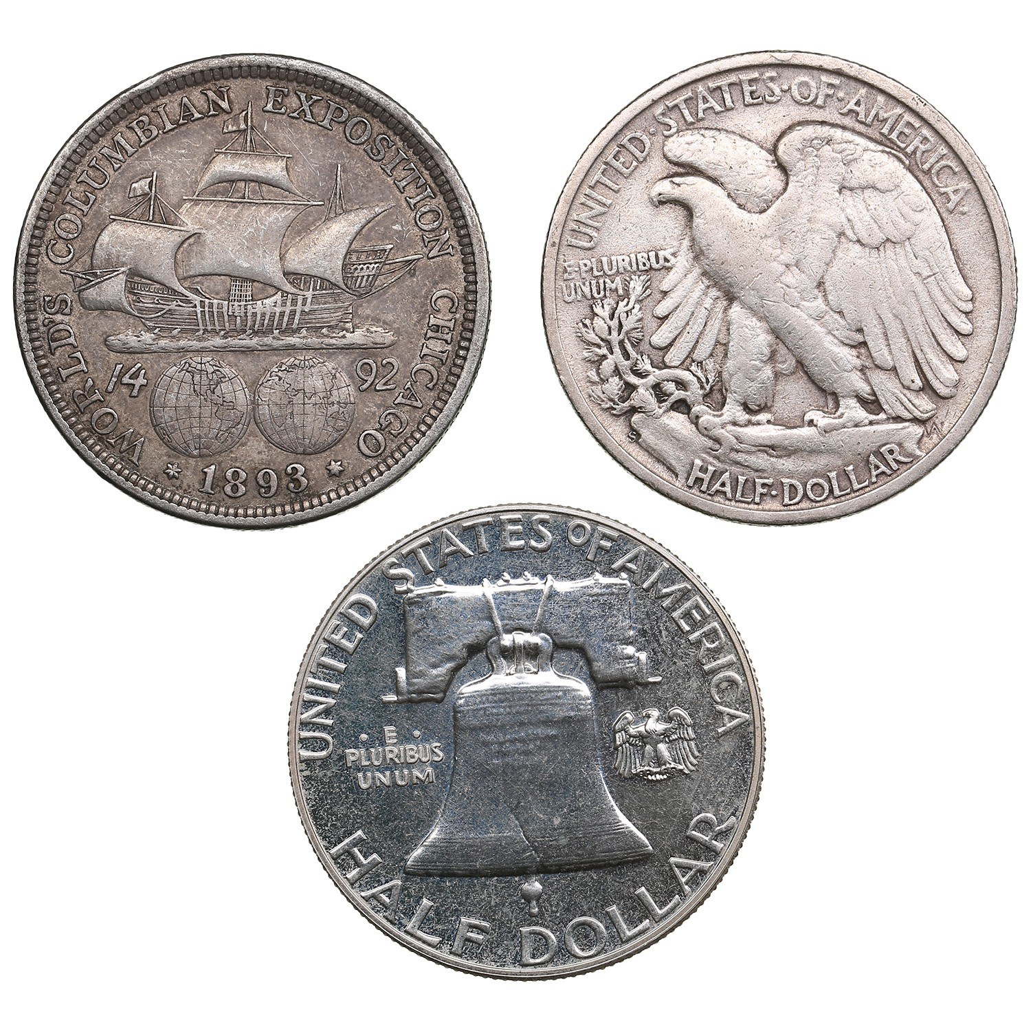 VF-PROOF. Columbian Exposition. KM 117. ‘Walking Liberty’ type. KM 142. ‘Franklin Half Dollar’ type. KM 199.