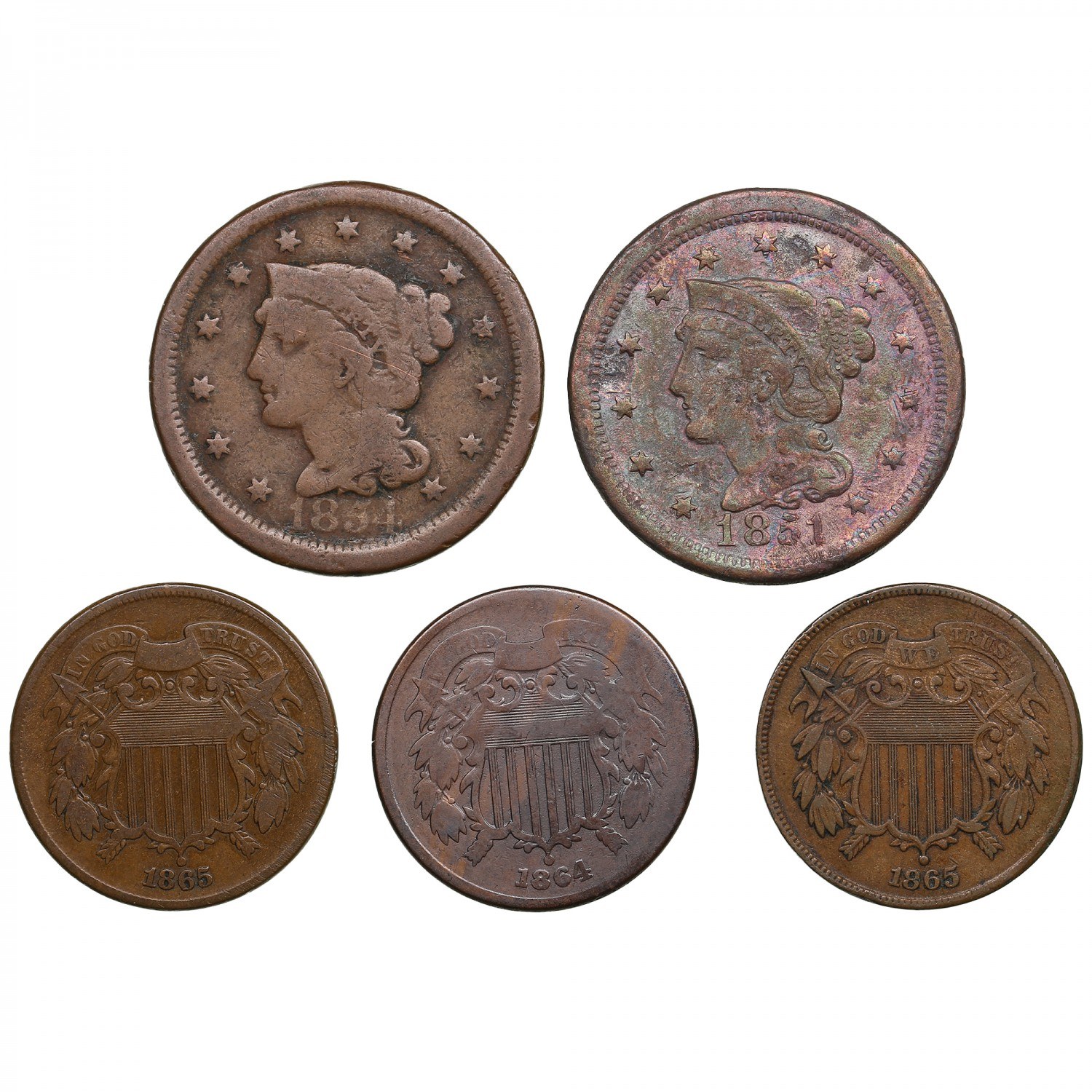 USA 2 Cents 1864, 1865, 1 Cent 1851, 1854 (5)