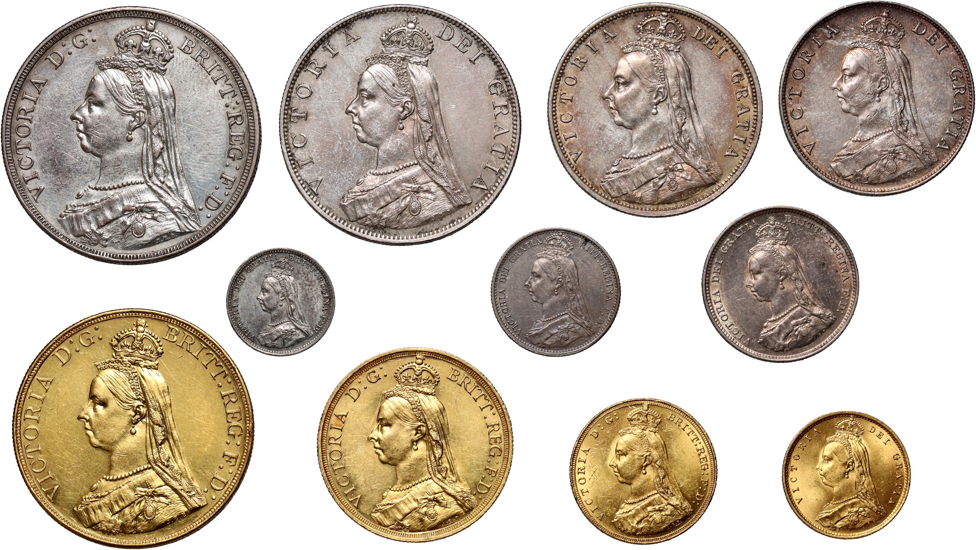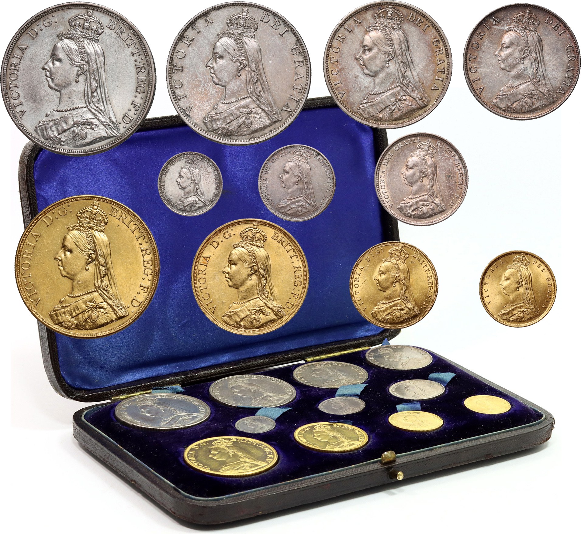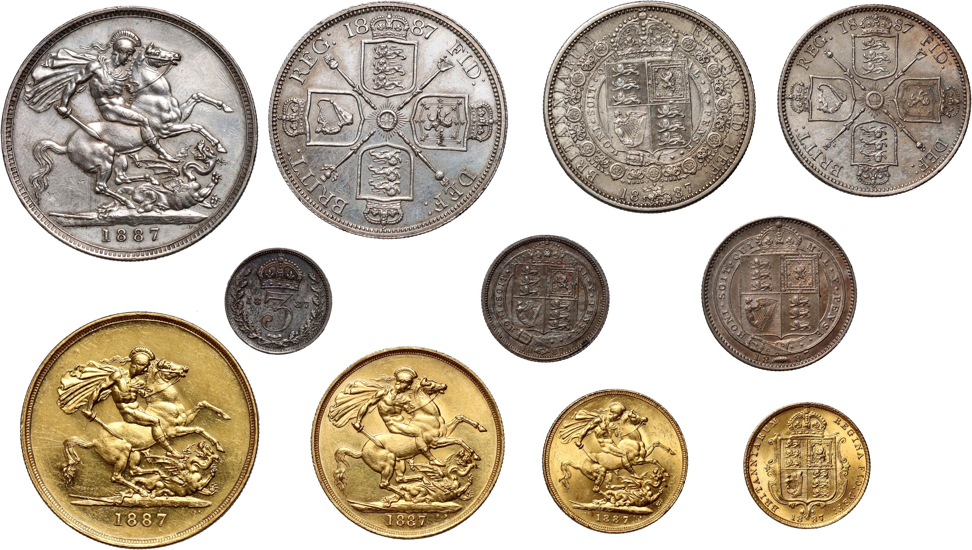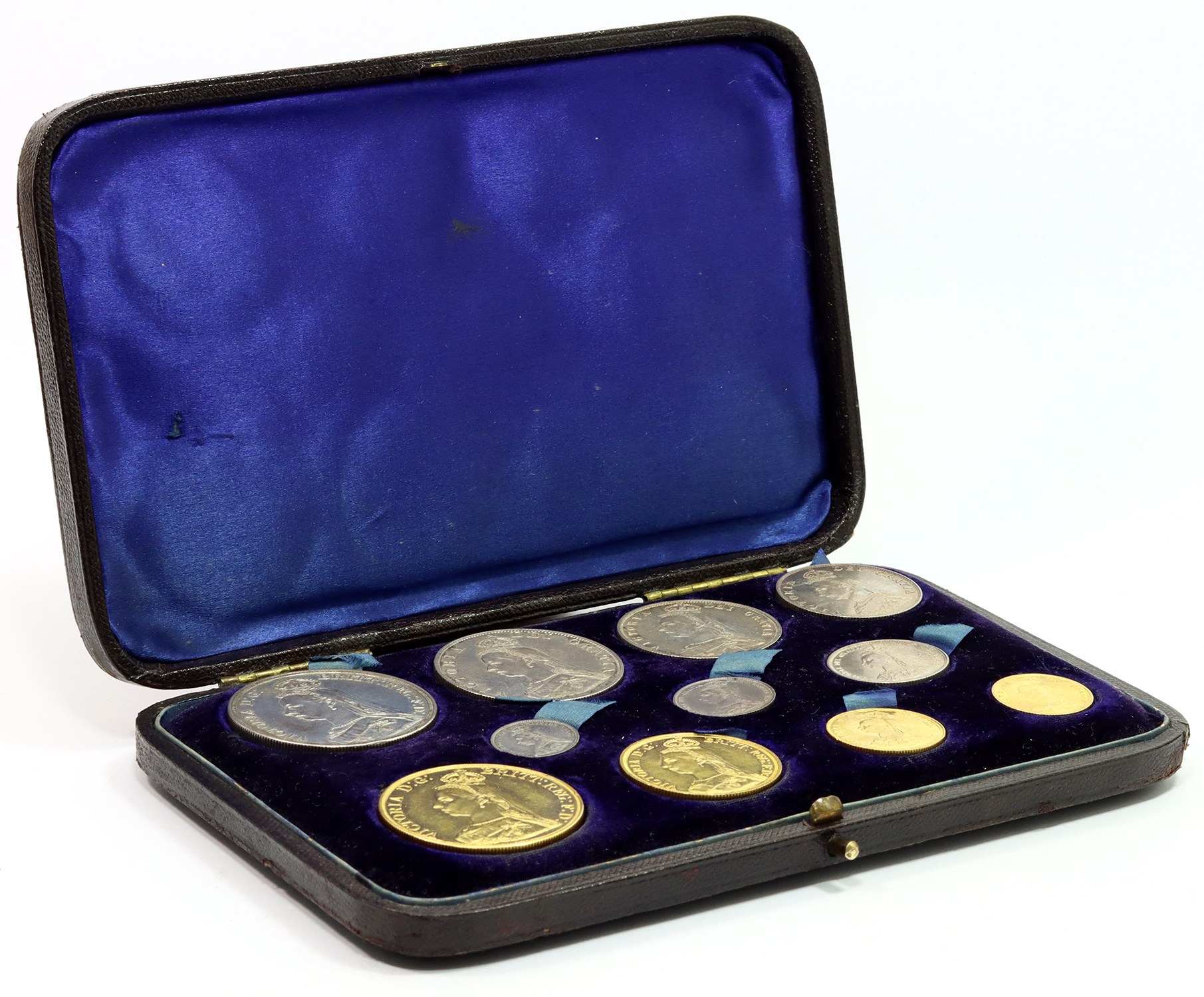Set of four gold and seven silver coins from 3 Pence up to 5 Pounds. Original black box.