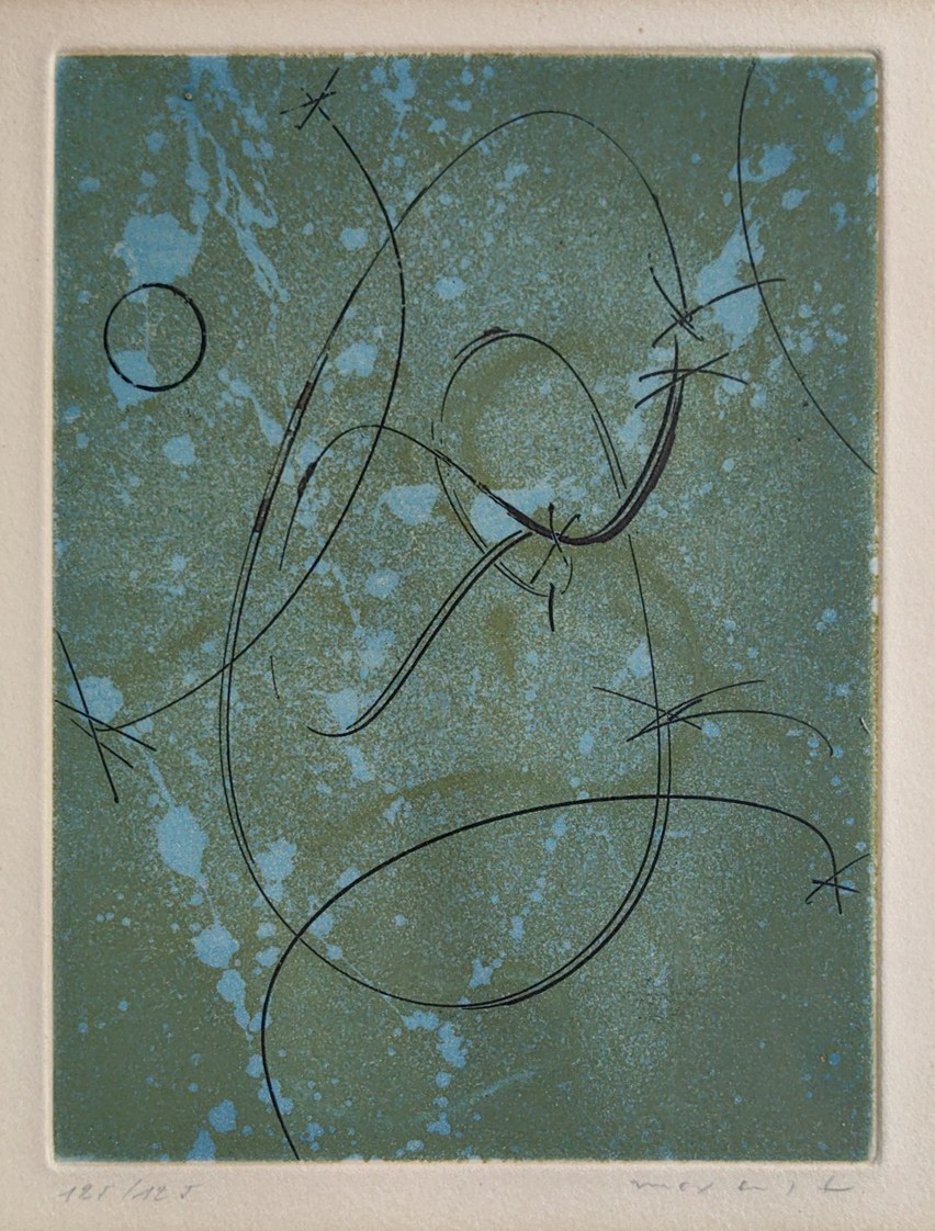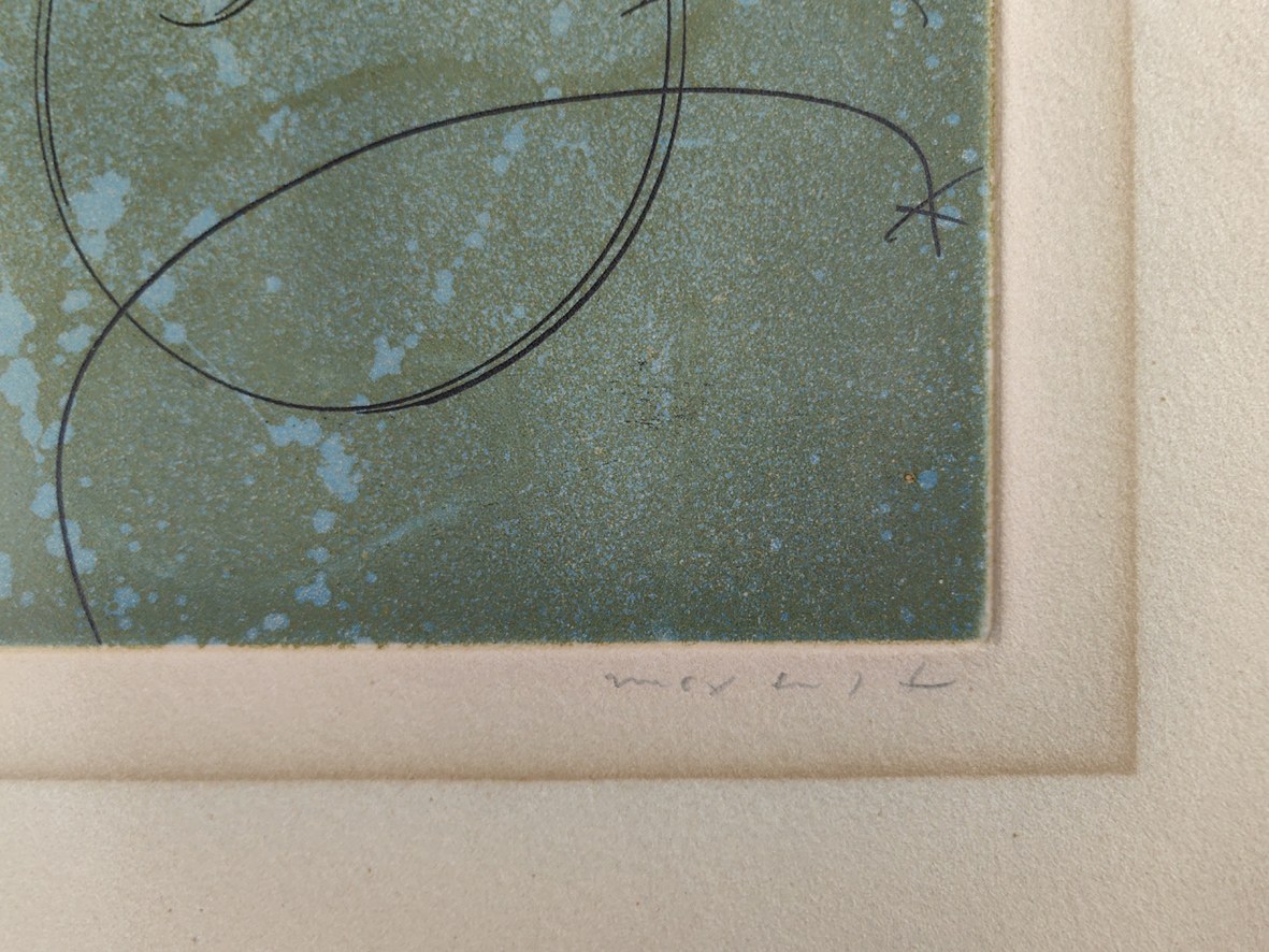 Prezentowana praca graficzna to rzadkie, późne dzieło Maxa Ernsta — jednego z najważniejszych twórców XX wieku — wykonane jako hołd dla jego przyjaciela i artystycznego towarzysza, Marcela Duchampa. Powstała w ramach teki „Monument à Christophe Colomb et à Marcel Duchamp” wydanej przez prestiżową oficynę Éditions Georges Visat w 1970 roku. Grafika łączy automatystyczny rysunek z elementami kontrolowanej kompozycji — plamy barwne i delikatne gesty piórka sugerują formy organiczne i niemal biologiczne struktury, bliskie wizualizacji impulsów podświadomości.