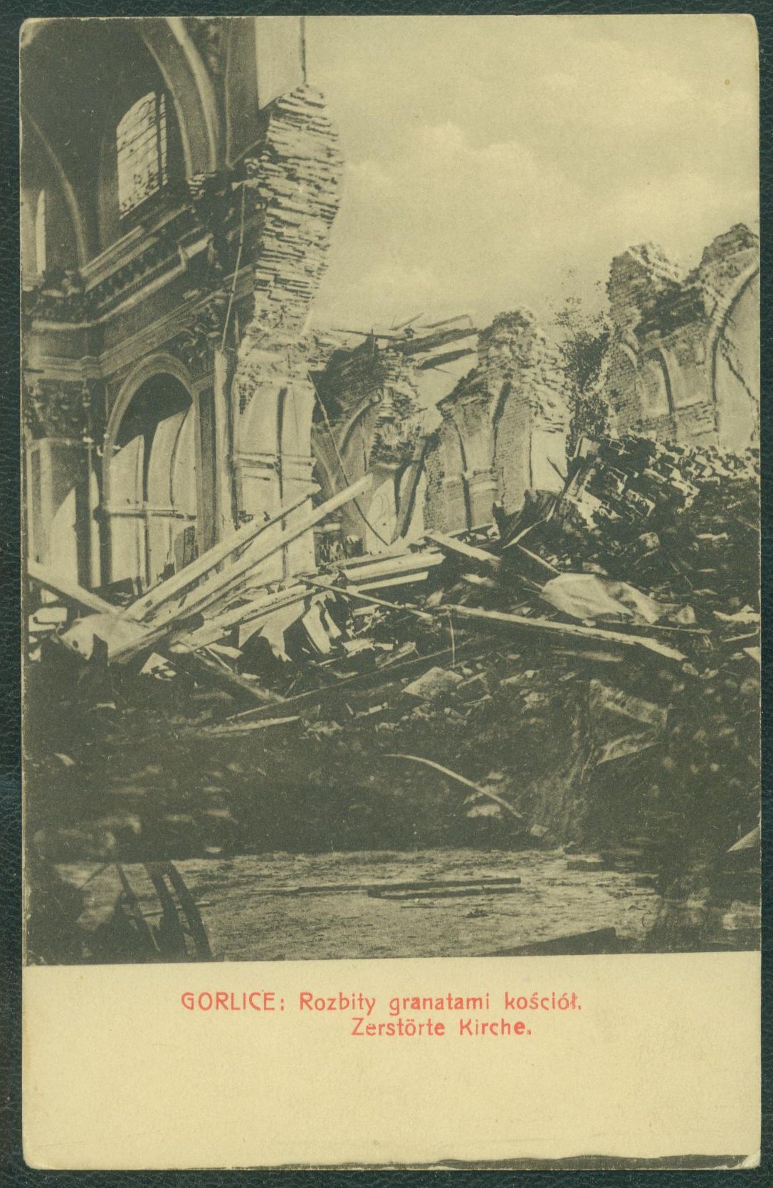 GORLICE – Rozbity granatami kościół, Wyd. art. poczt. Polonia, Jarosław 1916, św. sepia,