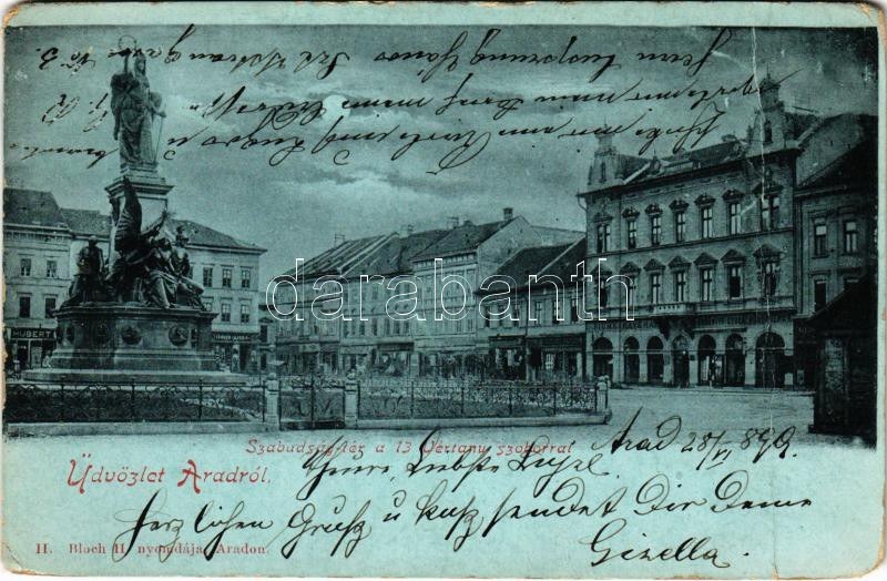 1899 (Vorläufer) Arad, Szabadság tér, 13 Vértanú szobor, Rosenberg és Derestye Gyula üzlete, Fiume kávéház. H. Bloch kiadása / square, monument, shops, cafe (fa)
