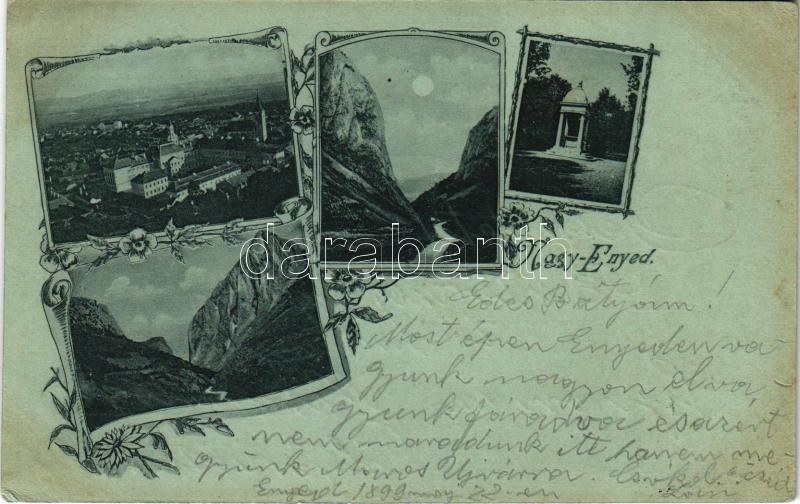 1899 (Vorläufer) Nagyenyed, Aiud; látkép, sétatéri síremlék, este / general view, monument, night. Art Nouveau, floral