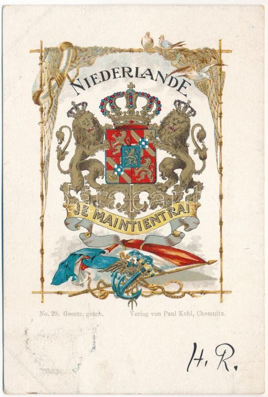1899 (Vorläufer) Niederlande Je Maintiendrai / Coat of arms of the Netherlands "I shall maintain". Verlag von Paul Kohl No. 29. golden decoreted, litho
