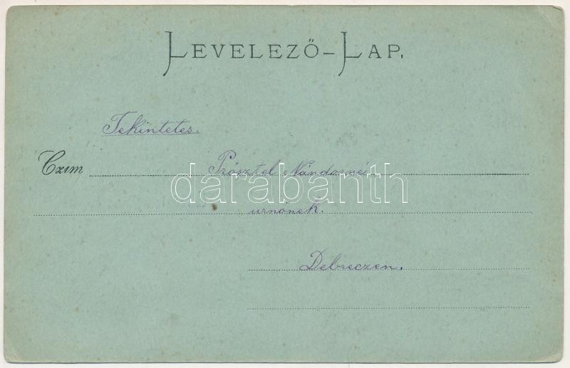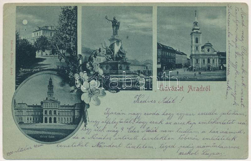 1900 Arad, Baross park, Vértanúk szobra, Római katolikus templom, Városháza. Révész Nándor kiadása / park, monument, Catholic church, town hall. Art Nouveau floral (EK)