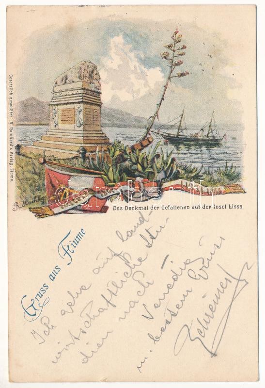 1900 Gruss aus Fiume, Das Denkmal der Gefallenen auf der Insel Lissa. A. Reinhard. K.u.K. Kriegsmarine / Osztrák...