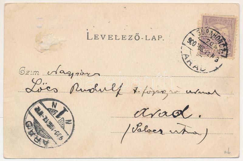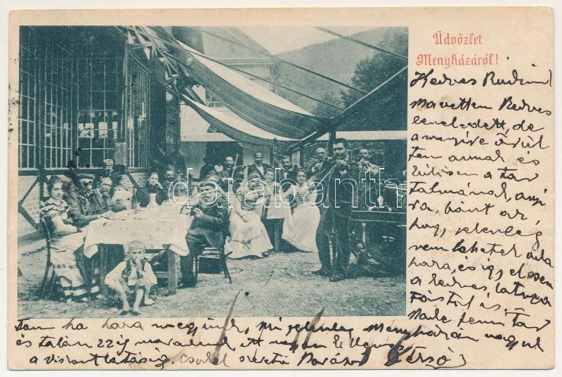 1900 Menyháza, Monyásza, Moneasa; vendéglő, étterem kertje vendégekkel és zenészekkel / restaurant garden with guests and musicians + "GURAHONCZ - ARAD 70. SZ." vasúti mozgóposta bélyegző (ragasztónyom / glue marks)