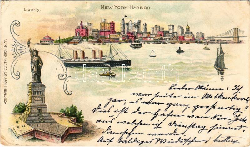 1900 New York, Harbor, Statue of Liberty, steamships. Copyright 1897 by C.F.TH. Kreh. litho (EK)
