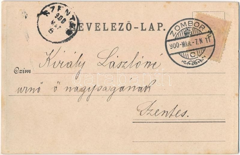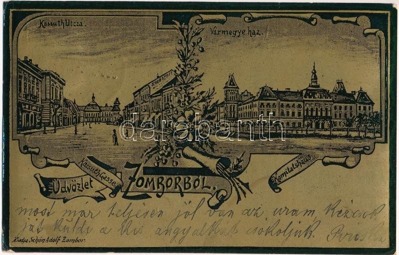 1900 Zombor, Sombor; Vármegye ház, Kossuth utca. Kiadja Schön Adolf, szecessziós fémes hatású fóliás képeslap ...