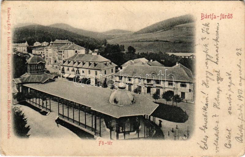 1901 Bártfa-fürdő, Bardejovské Kúpele, Bardiov, Bardejov; Fő tér. Eschwig és Hajts kiadása. Hajts Kornél felvétele ...