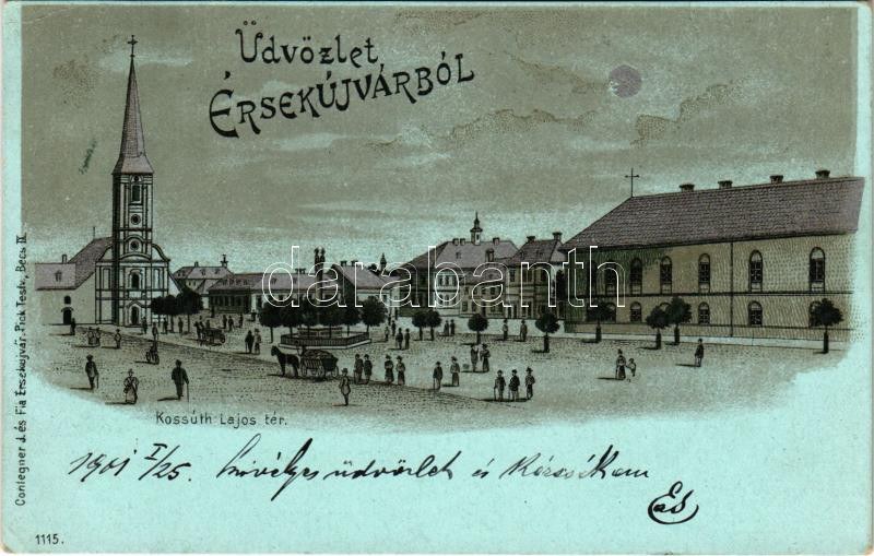 1901 Érsekújvár, Nové Zámky; Kossuth Lajos tér, templom, tér. Conlegner J. és Fia kiadása / church, square. Art Nouveau, litho (EK)