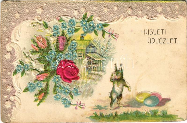 1901 Húsvéti üdvözlet! Dombornyomott nyuszis litho képeslap selyem rátéttel / Easter greeting, rabbit. Embossed, floral...