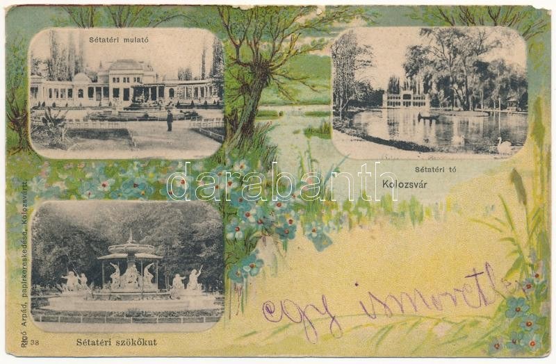 1901 Kolozsvár, Cluj; Sétatéri mulató, szökőkút és tó. Szecessziós erdős litho montázs. Rigó Árpád kiadása ...