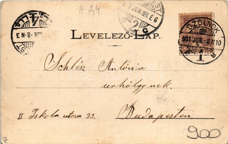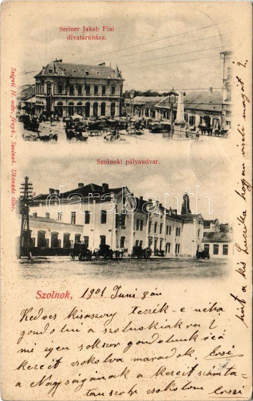 1901 Szolnok, Steiner Jakab Fiai divatáruháza, üzletek, piac, Pályaudvar, vasútállomás. Szigeti H. udvari fényképész (EK)