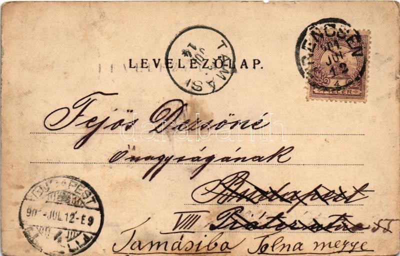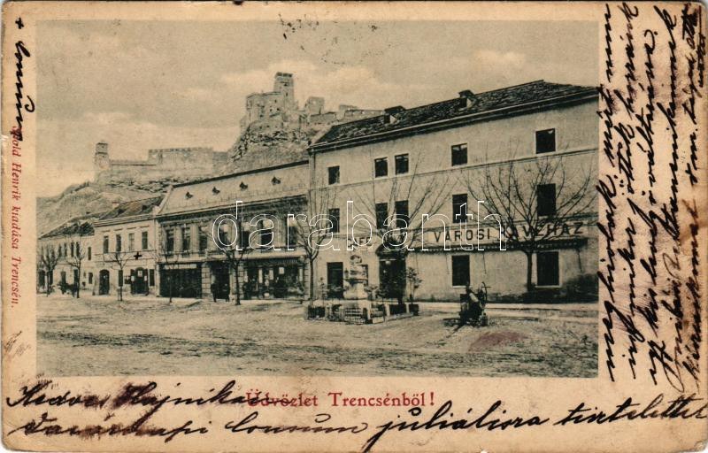 1901 Trencsén, Trencín; Városi kávéház, vár, üzletek. Szold Henrik kiadása / café, castle, shops (szakadások / tears...