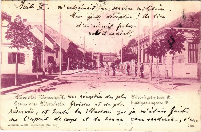 1901 Versec, Werschetz, Vrsac; Városliget utca B., posta és távirda. Wilhelm Wettl kiadása / street, post and telegraph office