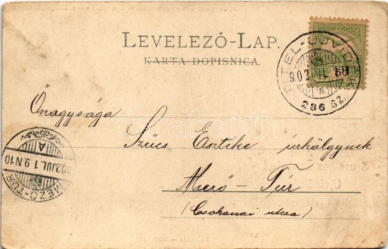 1902 Újvidék, Novi Sad; színház, M. kir. posta és távirda hivatal, Városház / theatre, post and telegraph office, town hall. Art Nouveau, floral (Rb)