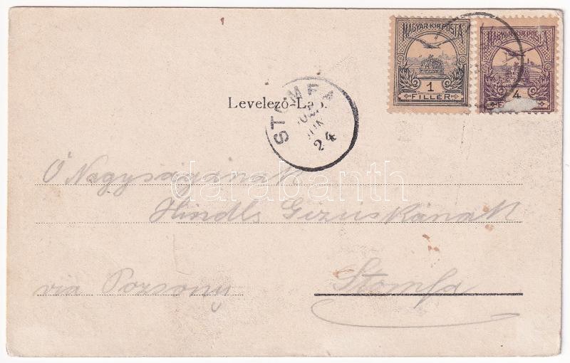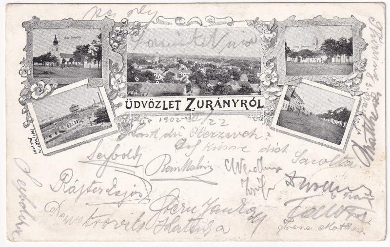 1902 Zurány, Zarándfalva, Zurndorf; Római katolikus templom, Dinamitgyár, látkép, Evangélikus templom, Fő utca. Freistadt M. kiadása / Catholic church, dynamite factory, Lutheran church, general view, main street. Art Nouveau, floral (EK)