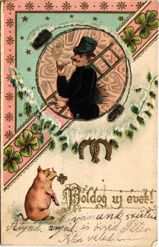 1903 Boldog Újévet! Dombornyomott szecessziós üdvözlőlap kéményseprővel, lóherével és malaccal ...