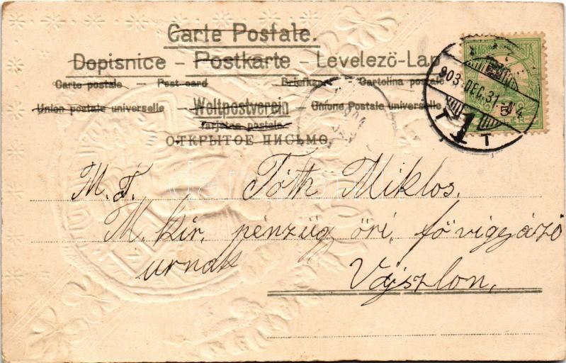 1903 Boldog Újévet! Dombornyomott szecessziós üdvözlőlap kéményseprővel, lóherével és malaccal / New Year greeting art postcard with chimney sweeper, clover and pig. Art Nouveau, floral. Emb. litho (EM)