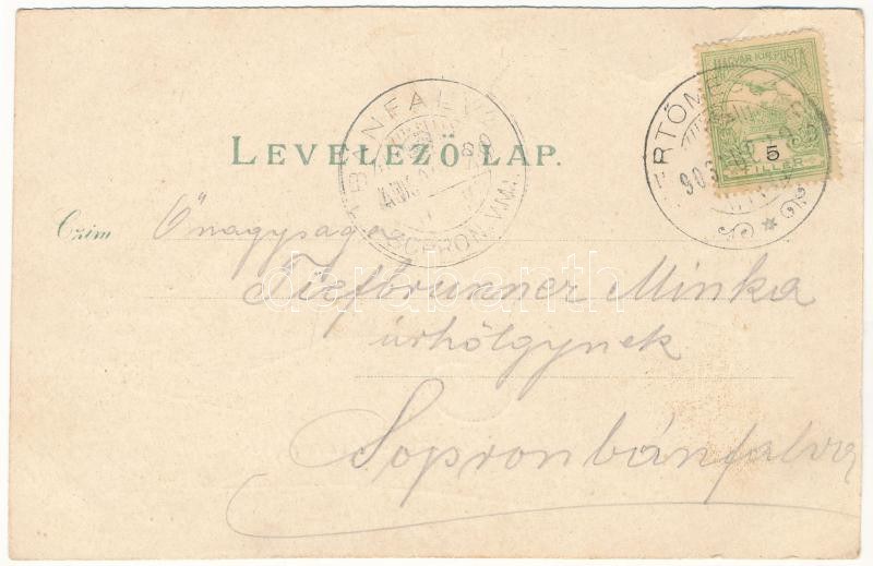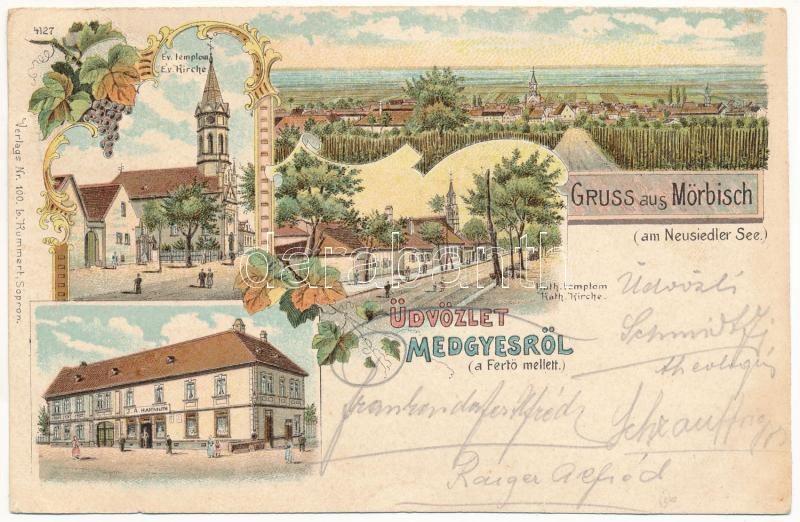 1903 Fertőmeggyes, Medgyes, Mörbisch am Neusiedler See; Evangélikus és katolikus templom, J.A. Harmuth üzlete / Kirche, Warenhandlung / churches, shop. L. Kummert Nr. 100. Art Nouveau, floral, litho (EK)