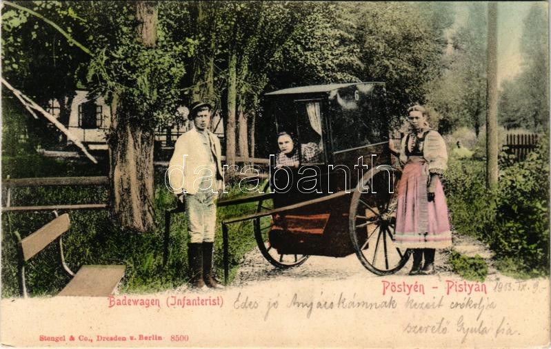 1903 Pöstyén, Piestany; Infanterista, fürdőkocsi / Badewagen (Infanterist) / spa carriage. Stengel & Co. (gyűrődés ...
