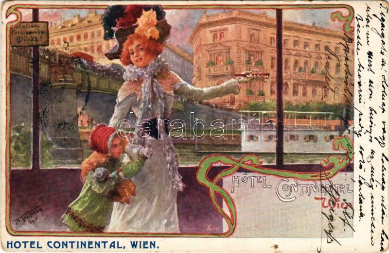 1903 Wien, Vienna, Bécs; Hotel Continental advertisement card with lady. Art Nouveau s: A. Trentin (worn corners...