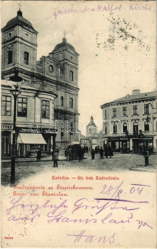1904 Ivano-Frankivsk, Stanislawów, Stanislau; Katedra / Gr. kat. Kathedrale / cathedral, shops (fl)