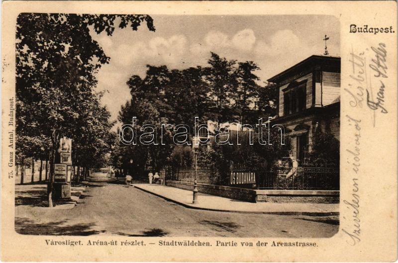 1905 Budapest XIV. Városliget, Aréna út (Dózsa György út) részlete, Ős Budavára reklám, hirdetőoszlop plakátokkal. Ganz Antal 75.