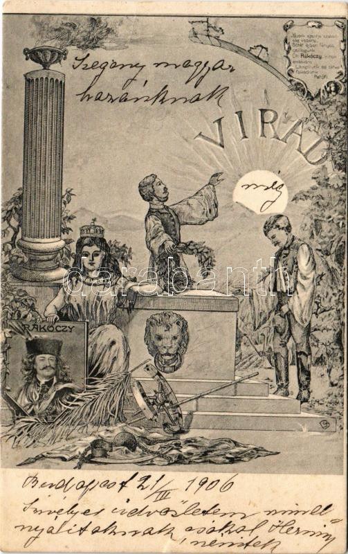 1906 II. Rákóczi Ferenc szecessziós emléklap. Hazánk szentje, szabadság vezére, Sötét éjben fényes csillagunk...