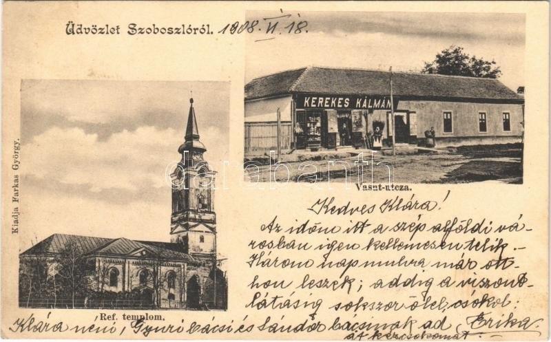 1908 Hajdúszoboszló, Református templom, Vasút utca, Kerekes Kálmán üzlete...