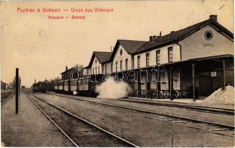 1908 Vinkovce, Vinkovci; Kolodvor / Bahnhof / vasútállomás, gőzmozdony, vonat. W.L. Bp. 741. / railway station, train, locomotive (EK)