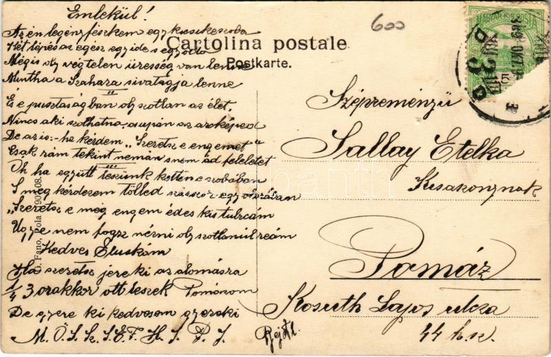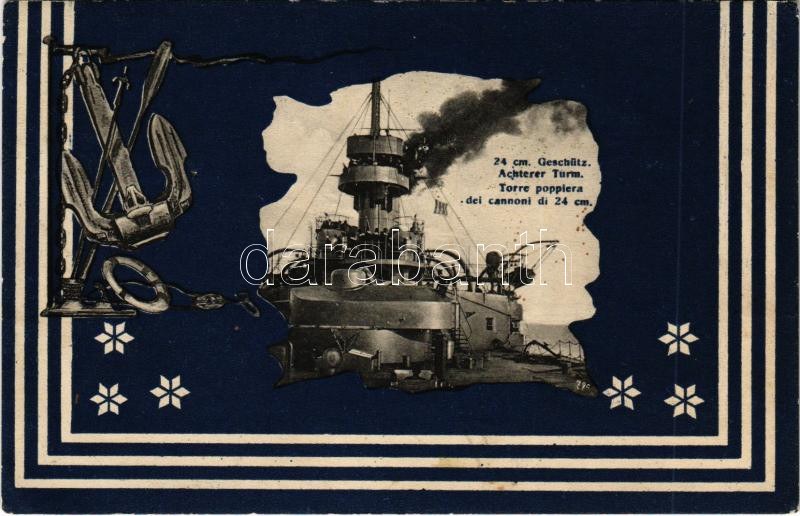 1909 K.u.K. Kriegsmarine 24 cm Geschütz Achterer Turm / Osztrák-magyar haditengerészet hadihajójának 24 cm-es lövege. Szecessziós lap vasmacskával / Austro-Hungarian Navy cannon. Art Nouveau, G. Fano, Pola 1907-08. (EK)
