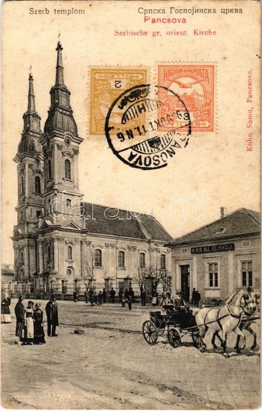 1909 Pancsova, Pancevo; Serbische gr. orient. Kirche / Szerb ortodox templom, M. kir. állami elemi iskola...