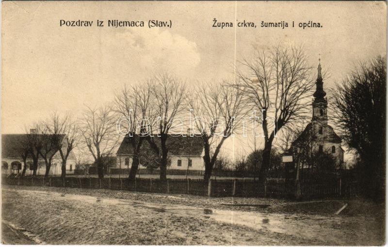 1910 Csótnémeti, Njemci, Nijemci; Pozdrav iz Nijemaca (Slav.), Zupna crkva, sumarija i opcina. A. Gomercic fotograf ...