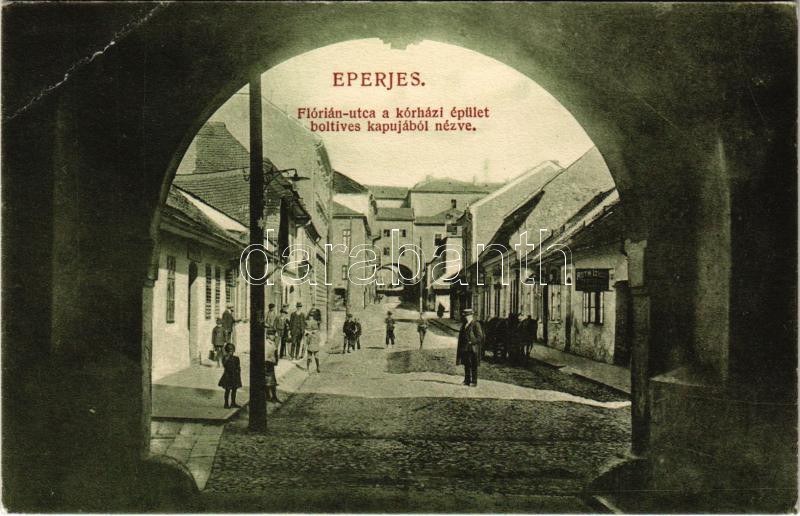 1910 Eperjes, Presov; Flórián utca, kórházi épület boltíves kapujából nézve, Roth Izidor üzlete. Divald Károly fia ...
