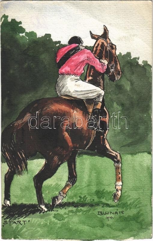 1910 Start / Lovassport. Kézzel rajzolt művészlap / Equestrian sport, horse racer. Hand-painted art postcard s: Bujnák (non PC) (EK)
