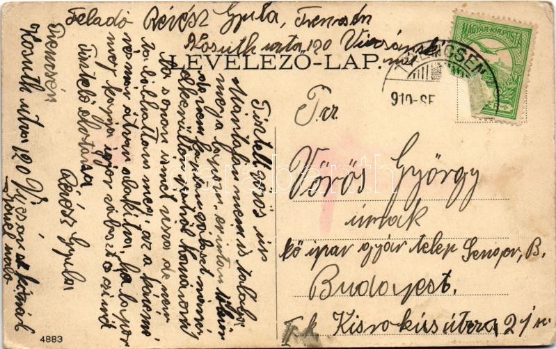 1910 Trencsén, Trencín; látkép, vár, híd, faúsztatás tutajokon / general view with castle, bridge, timber transport with rafts (EK)