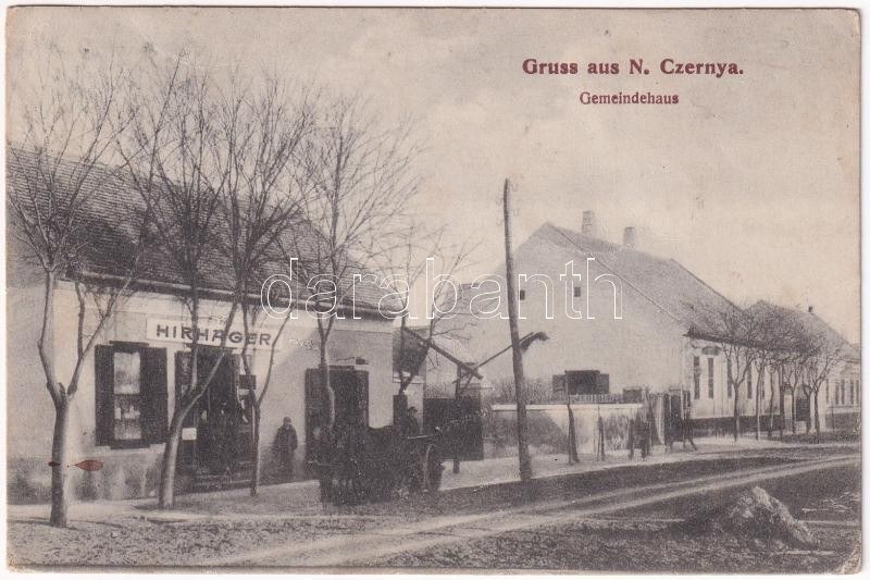 1911 Szerbcsernye, Németcsernye, Szerb-Czernya, Német-Czernya, Srpska Crnja (Magyarcsernye, Nova Crnja); Gemeindehaus / Községháza, Hirhager üzlete / town hall, shop (EK)
