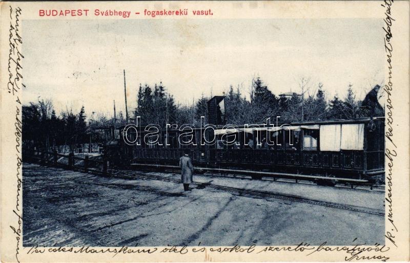 1912 Budapest XII. Svábhegy, fogaskerekű vasút megállóhelye vonattal, vasútállomás. Szerényi Béla kiadása (fl)