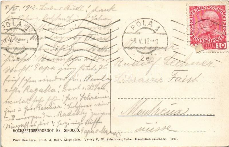 1912 K.u.K. Kriegsmarine Hochseetorpedoboot bei Sirocco. Phot. A. Beer, F.W. Schrinner Pola 1911 s: Ramberg