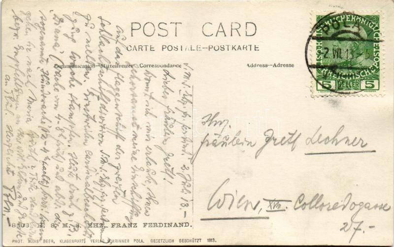1913 SMS Erzherzog Franz Ferdinand az Osztrák-Magyar Haditengerészet Radetzky-osztályú csatahajója / K.u.K. Kriegsmarine / WWI Austro-Hungarian Navy ironclad warship. Phot. Alois Beer, Schrinner Pola 1913.