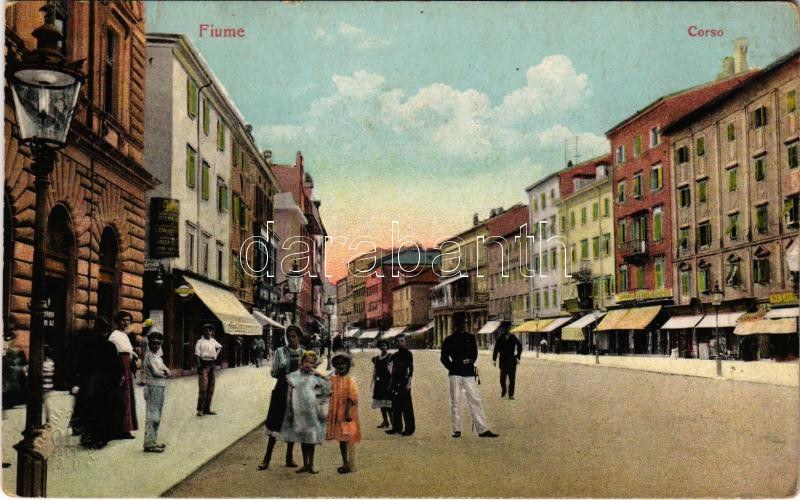 1914 Fiume, Rijeka; Corso, La Voce del Popolo, Minerva, Lotteria, Michelin / utca üzletekkel, osztálysorsjegy / street with shops