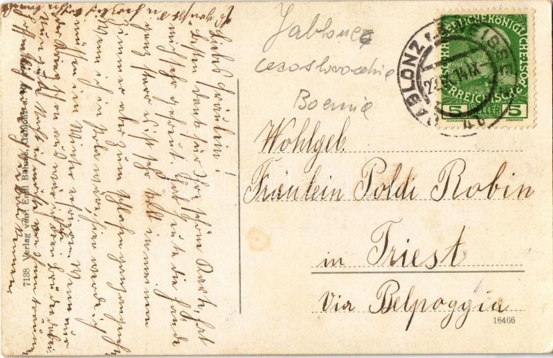 1914 Jablonec nad Nisou, Gablonz; Alter Markt / market, trams, Hotel Erlebach, shops of Carls Weiss and Blumen (EK...