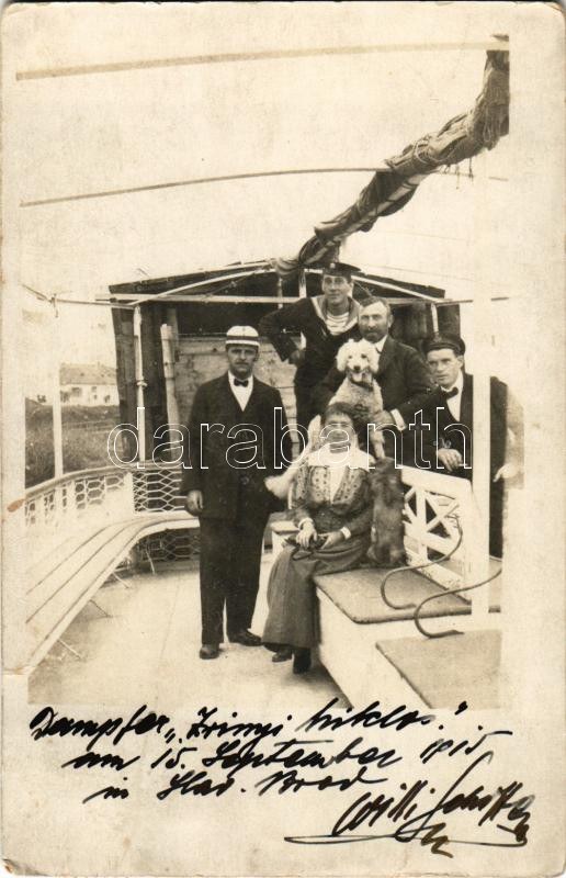 1915 Dampfer Zrínyi Miklós / ZRÍNYI MIKLÓS gőzhajó, fedélzet matrózzal és kutyákkal...