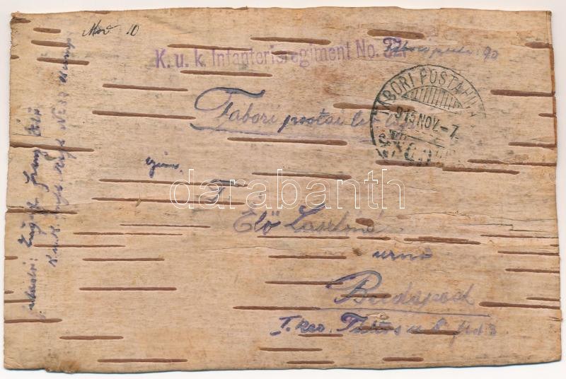 1915 Oroszország. Első világháborús osztrák-magyar tábori posta nyírfakéregből / WWI K.u.k. military field post made of birch tree bark from Russia + "K.u.k. Infanterieregiment No. 32."