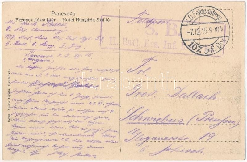 1915 Pancsova, Pancevo; Ferenc József tér, Hotel Hungária szálloda, Lang Ádám, Nádor Gyula üzlete és saját kiadása ...